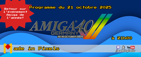 Mise à jour du 22 octobre 2025 : Le live est désormais disponible en "replay" sur la chaîne YouTube de Made in Pixels. Si vous n'avez pas pu regarder Fenrix en direct hier soir, vous n'avez plus aucune excuse ! Vidéo : https://www.youtube.com/live/aALqNd4plYQ Information postée le 21 octobre 2025 : Après un week-end très intense à l'Amiga 40 à Mönchengladbach, la chaîne Made in Pixels (animé par l'excellent Fenrix) vous propose de faire le tour du salon, de découvrir quelques nouveautés qui y étaient présentées et de rencontrer quelques personnalités qui avaient fait le déplacement. ![]() L'occasion aussi de discuter de l'histoire de l'Amiga, de faire un point sur les projets actuels et de partager le ressenti sur cet événement hors norme. Rendez-vous mardi 21 octobre à partir de 21h00 sur la chaîne de Made in Pixels, sur Twitch ou YouTube. Site internet : https://www.youtube.com/@madeinpixels |
